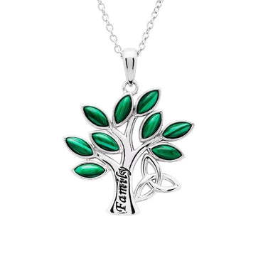 This sterling silver necklace has a slim silver chain and a tree-shaped pendant with a trinity knot. The leaves of the tree are set with deep green...
