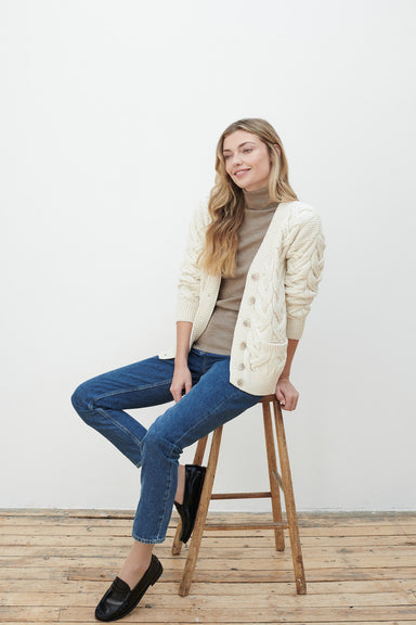 View Size Guide Our traditional Irish Aran Cardigan for women is made from 100% Merino Wool. This is a timeless and elegant classic featuring the...