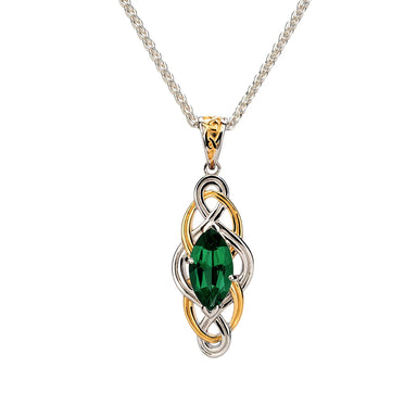 This sterling silver necklace has a slim silver chain and a tree-shaped pendant with a trinity knot. The leaves of the tree are set with deep green...