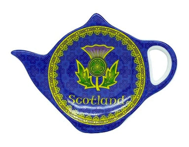 This bone china teabag holder depicts a highly ornate pattern, featuring a golden thistle with a triple spiral at its heart. It is bordered by neve...