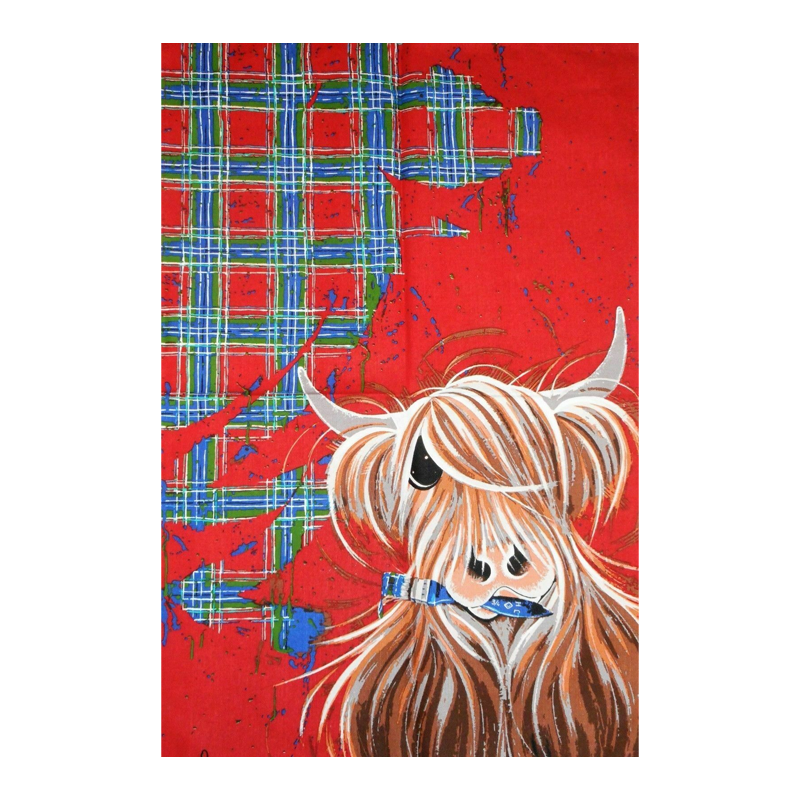 An adorable tea towel featuring McMoo creating a tartan painting.